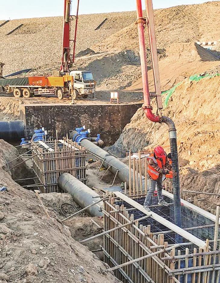 石門溝2號水庫供水管道工程施工現(xiàn)場,各種機械配合工人正在忙碌地進行管溝開挖、管道鋪設、焊接、試壓等工序。項目實施后可進一步優(yōu)化新區(qū)水資源配置,提高新區(qū)生活工業(yè)用水保障率。