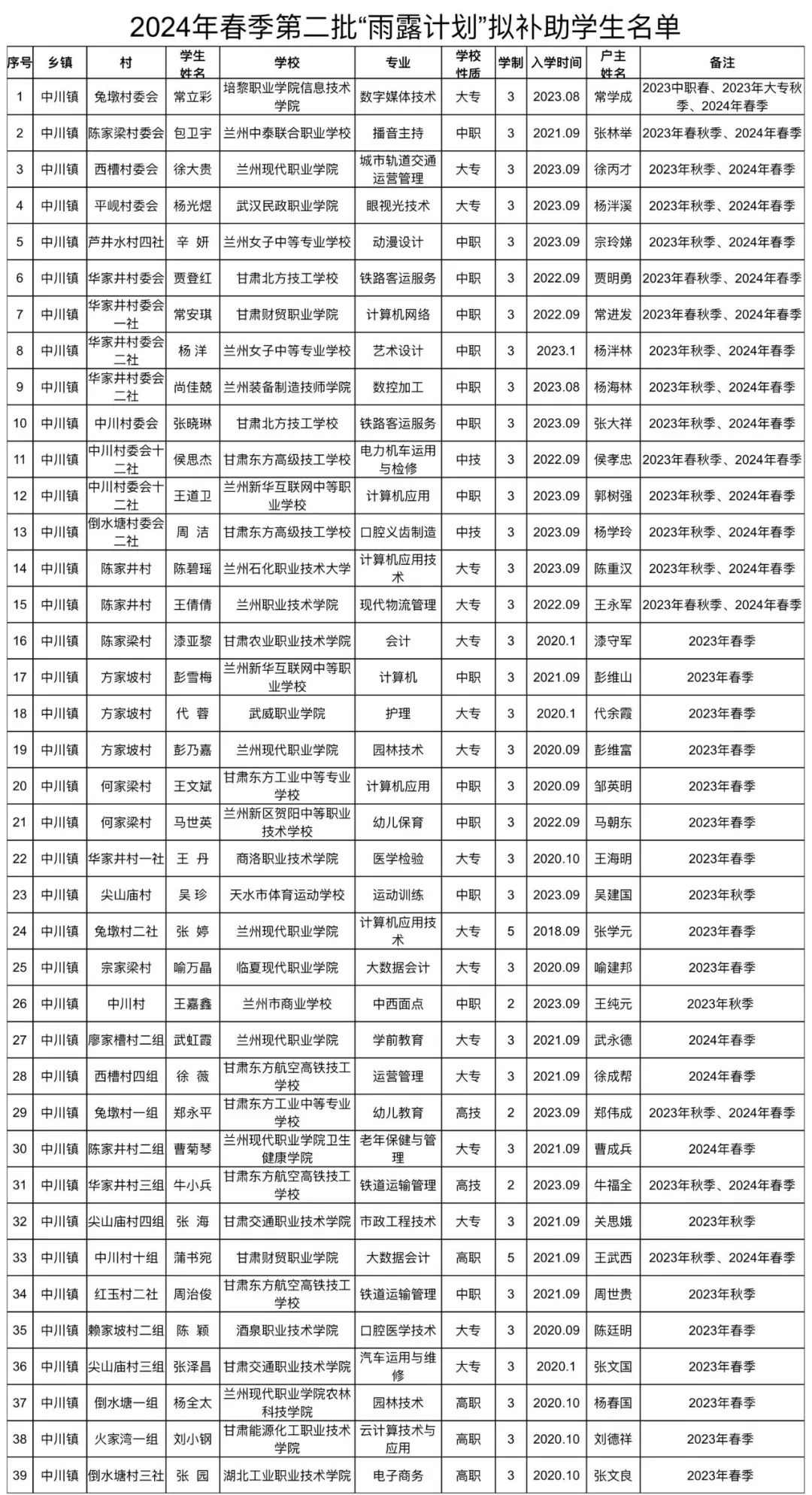 根據(jù)《蘭州新區(qū)農(nóng)林水務(wù)局<關(guān)于規(guī)范落實(shí)“雨露計(jì)劃”補(bǔ)助資金切實(shí)做好排查整改工作的通知>》及《甘肅省扶貧辦 甘肅省教育廳 甘肅省人社廳<關(guān)于印發(fā)進(jìn)一步做好雨露計(jì)劃支持農(nóng)村貧困家庭新成長(zhǎng)勞動(dòng)力接受職業(yè)教育的實(shí)施意見(jiàn)的通知>》(甘開(kāi)辦發(fā)(2019)197號(hào))要求,按照每人每學(xué)期1500元的標(biāo)準(zhǔn),對(duì)農(nóng)村脫貧戶(hù)(含監(jiān)測(cè)幫扶戶(hù))家庭子女接受中、高等職業(yè)教育的學(xué)生進(jìn)行職業(yè)技能培訓(xùn)補(bǔ)助?,F(xiàn)對(duì)2024年春季第二批“雨露計(jì)劃”補(bǔ)助資金進(jìn)行公示(含2023年春秋季補(bǔ)發(fā))(名單詳見(jiàn)附件)。如發(fā)現(xiàn)學(xué)生學(xué)籍、建檔立卡戶(hù)資格方面和公示內(nèi)容不一致等問(wèn)題,可通過(guò)電話(huà)、來(lái)信、來(lái)訪(fǎng)等方式及時(shí)反映,以便調(diào)查核實(shí)。