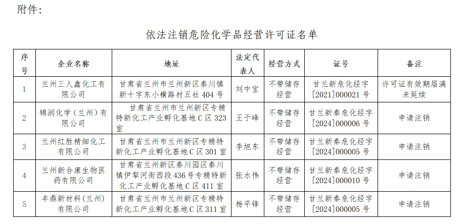 截至2024年7月29日,由于我園區(qū)1家企業(yè)的《危險化學品經(jīng)營許可證》(見附件)有效期屆滿未延續(xù),4家企業(yè)因為企業(yè)自主申請注銷,依據(jù)《中華人民共和國行政許可法》第七十條第(一)項、《危險化學品經(jīng)營許可證管理辦法》(原國家安全監(jiān)管總局令第55號)第二十七條第一款第(一)項、第(二)項的規(guī)定,決定對蘭州三人鑫化工有限公司、錦潤化學(蘭州)有限公司、蘭州紅勝精細化工有限公司、蘭州新合康生物醫(yī)藥有限公司、豐鼎新材料(蘭州)有限公司《危險化學品經(jīng)營許可證》依法予以注銷。